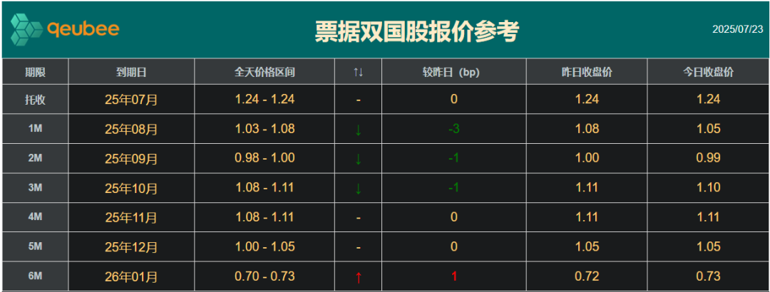 数据来源:qeubee从票据与国债、同业存单的利差来看,截至7月23日,票据与国债的利差为-64BP,票据与同业存单的利差为-89BP,票据利率继续位于国债利率下方。