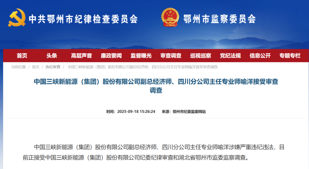 其中,中国三峡新能源(集团)股份有限公司副总经济师、四川分公司主任专业师喻洋涉嫌严重违纪违法,目前正接受中国三峡新能源(集团)股份有限公司纪委纪律审查和湖北省鄂州市监委监察调查。